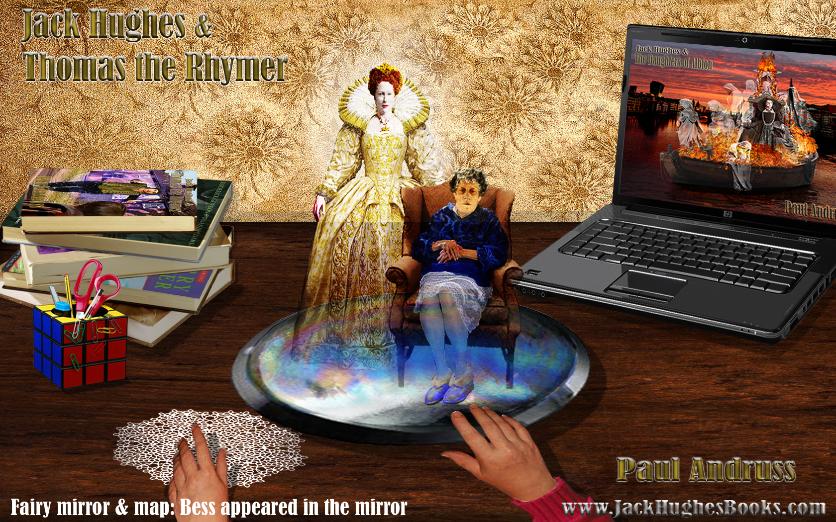 The hill was ringed by standing stones. A large handsome house stood concealed by an overgrown wood. It was exactly what Jack described from his dreams. As she stared, a beautiful fairy queen welled up from the mirror’s depths to give a friendly wave.